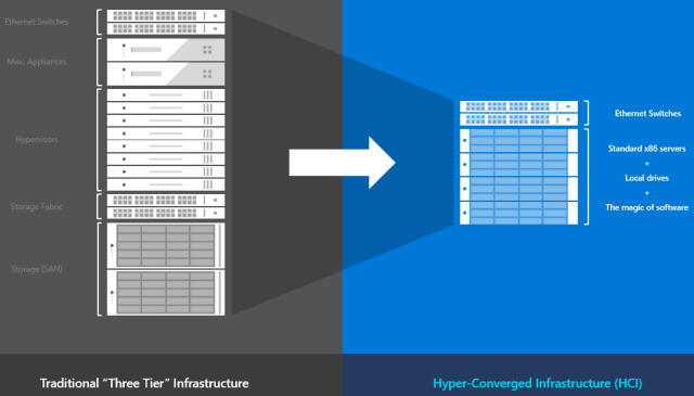 Si tratta di una infrastruttura hyper-converged (HCI), dove vengono rimossi diversi componenti hardware, sostituti dal software, in grado di unire i layer di elaborazione, storage e rete in un’unica soluzione. In questo modo si ha un passaggio da una tradizionale infrastruttura “three tier”, composta da switch di rete, appliance, sistemi fisici con a bordo hypervisor, storage fabric e SAN, verso infrastrutture hyper-converged (HCI).